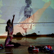 The work progresses through various mood and color shifts, all exploring femininity as spectacle - and my relationship to the audience within our intimate context. I make my way into the paint, ultimately mixing and spreading it all over the white tarp and my own body. The projection fades into quick cuts between a sideways American flag (resembling prison bars) and a stark white screen. Subtle paint fumes fill the room.