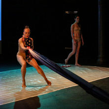 The introductory section parallels my own past adolescent ignorance of what feminism was; I use an environment of predictability spliced between “marketable utopia” and underlying rupture. The introduction fades into varying shades of blue projection, leading into the “striptease,” or the stripping of the flags. Each flag represents a layer of conditioned patriarchy—oppression, objectification, inequality. Each flag is an acknowledgment that, while I am in control of my actions, I am still controlled by the capitalist, nationalist umbrella. Once all flags are off, I am left with four flags sewn together with one end around my neck, an elongated flag leash representing oppression, objectification, and women as property (of men and of the system). Inspired by the second wave of feminism, I toy with my own “radical” experience, exploring femininity as spectacle, “masculine” movement interpretation, power dynamics of sexual exploitation, and desecration of the flag as protest.